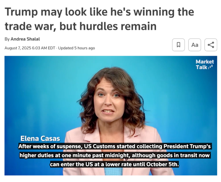 当地时间8月7日,美国新一轮关税政策正式落地。从高达100%的半导体进口关税,到对多个发展中国家商品实施“对等关税”,特朗普政府宣告“贸易战胜利在望”。然而,就在华盛顿庆祝“关税大限”如期执行之际,市场与政策观察人士却更关注接下来的另一个问题——美国准备好面对关税带来的全面挑战了吗?