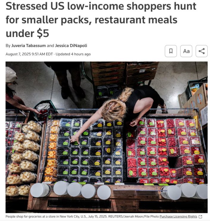 受关税影响,低收入家庭首先面临“价格挤压”,多个零售商报告称,消费者正转向“分量更小”的“低价套餐”,以“削减非必要支出”。